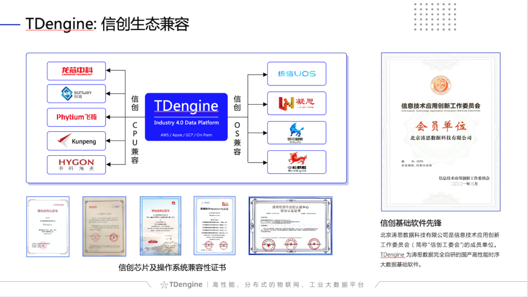 支持主流国产CPU平台:TDengine已经完成了与龙芯、鲲鹏、海光等主流国产CPU平台的兼容性认证,这表明TDengine可以无缝集成到这些平台上,为下游厂商提供国产化解决方案。