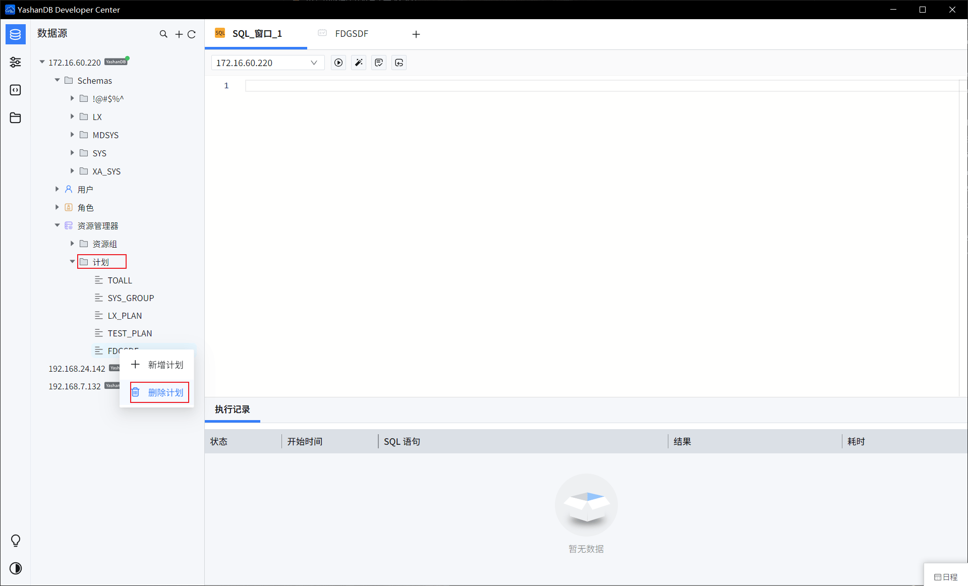 选择一个特定数据源,选择【资源管理器】>【计划】,选中某个特定计划单击鼠标右键,选择【删除计划】,二次确认后即可删除计划。