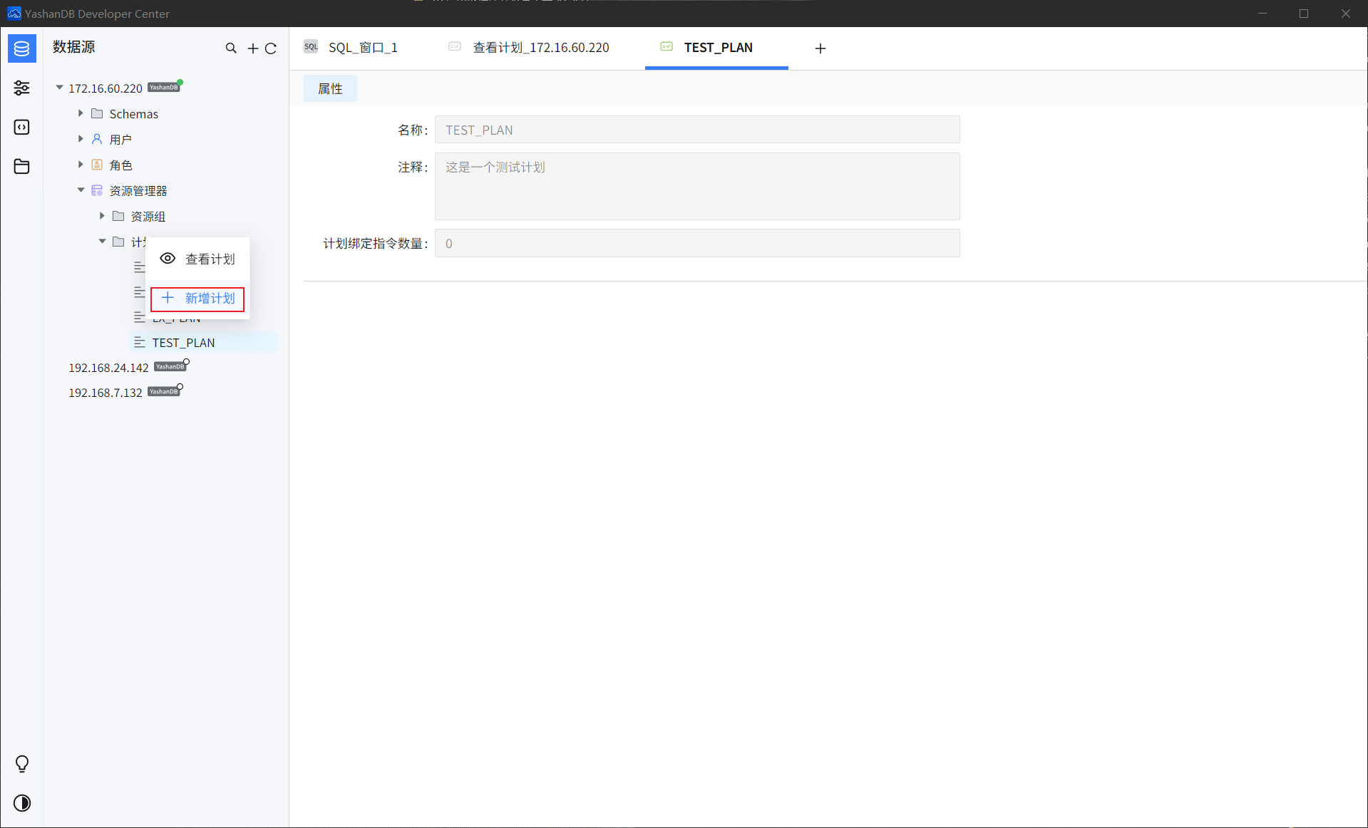 选择一个特定数据源,选择【资源管理器】>【计划】,鼠标右键单击【查看计划】即可打开查看计划面板。