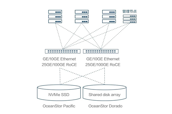 ● 高性价比方案:基于主备架构、存算一体的数据库一体机,面向小数据量(<25TB)的高负荷场景,磐维数据库配置3台高性能鲲鹏服务器运行磐维数据库,数据存储在本地磁盘空间,采用1主2备冗余模式,另外配置一台鲲鹏服务器运行运维管理工具。