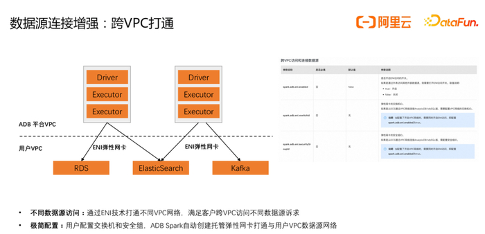最底层是ADB Spark支持的各类数据源,大体分为两类,一类是OSS/MaxCompute等通过AnyTunnel/STS Token进行授权访问的数据源,另一类是用户VPC下如ADB/RDS/HBase等需要通过ENI弹性网卡技术打通不同VPC网络才能访问的数据源。