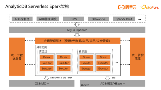 最上层是面向用户的使用入口,包括ADB SQL/Jar控制台、ADB作业调度控制台,以及阿里云DMS、Dataworks调度系统,以及贴合开源Spark用户使用习惯的SparkSubmit脚本方式。