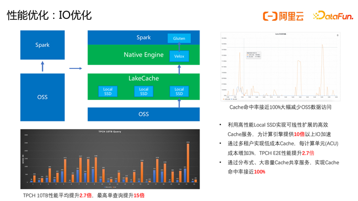 除针对CPU瓶颈作业进行优化外,ADB Spark也针对重IO作业进行了优化,构建了分布式缓存服务LakeCache。LakeCache利用高性能Local SSD实现可线性扩展的高效Cache服务,为计算引擎提供10倍以上IO加速。通过多租户实现低成本Cache,每计算单元(ACU)成本增加3%,TPCH E2E性能提升2.7倍。通过分布式、大容量Cache共享服务,实现Cache命中率接近100%,基于Native Engine的LakeCache Client也在进一步支持中。