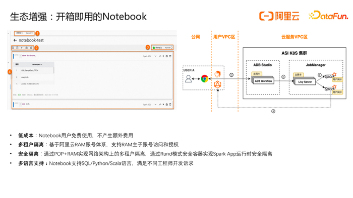 除了提供易于数据工程师开发调试作业的调度系统/控制台外,ADB Spark还提供了方便数据分析师使用的Notebook,借助Notebook和底层Spark强大的分布式能力,方便数据分析师进行数据分析,洞察数据价值。Notebook服务完全免费,用户通过ADB控制台便可开箱使用Notebook,Notebook当前支持SQL/Python/Scala语言来满足不同工程师需求。