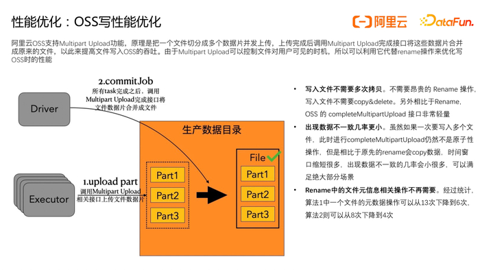 阿里云OSS支持Multipart Upload功能,原理是把一个文件切分成多个数据片并发上传,上传完成后调用Multipart Upload完成接口将这些数据片合并成原来的文件,以此来提高文件写入OSS的吞吐。由于Multipart Upload可以控制文件对用户可见的时机,所以可以利用它代替rename操作来优化写OSS时的性能,利用Multipart Upload方式有如下优势: