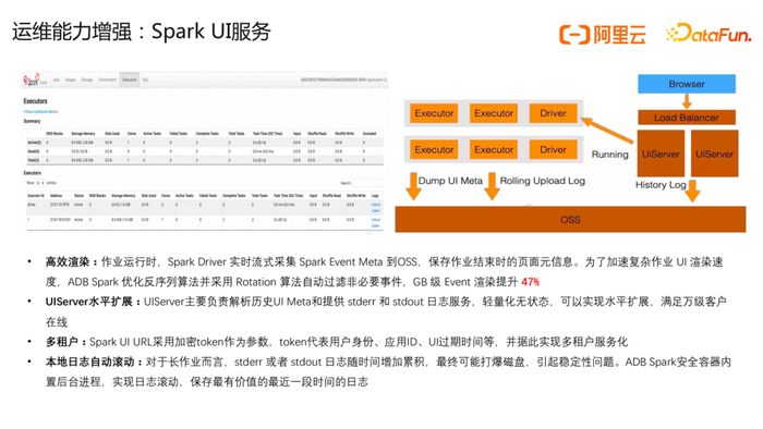 1.高效渲染:作业运行时,Spark Driver 实时流式采集 Spark Event Meta 到OSS,保存作业结束时的页面元信息。为了加速复杂作业 UI 渲染速度,ADB Spark 优化反序列算法并采用 Rotation 算法自动过滤非必要事件,GB 级 Event 渲染提升 47%