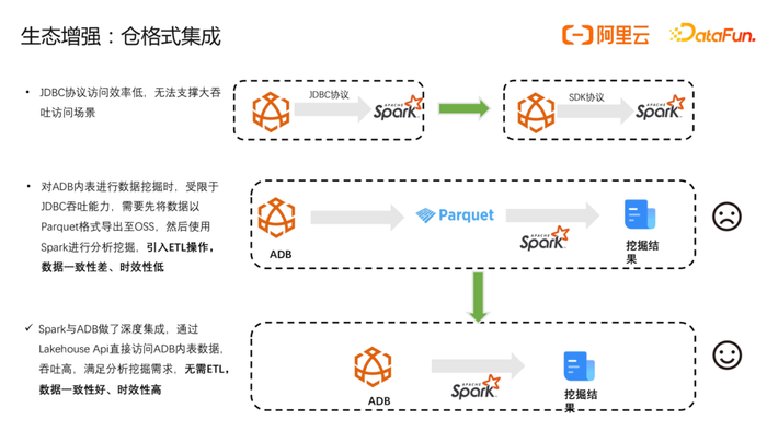 如客户有对内表进行挖掘分析的诉求,但受限于JDBC吞吐能力,需要先将数据以Parquet格式导出至OSS,然后使用Spark进行分析挖掘,引入ETL操作,数据一致性差、时效性低