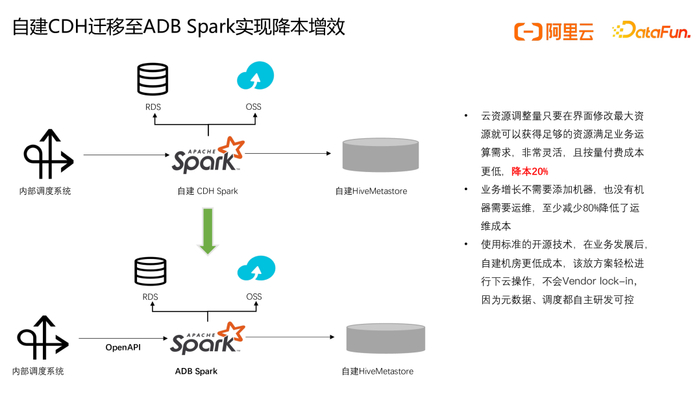 这个案例是从CDH迁移到ADB Spark实现降本增效的案例,客户调度系统和元数据中心都采用自建方案,存储使用OSS,计算采用自建 CDH Spark集群,但面临自建CDH节点扩缩容周期长,天维度扩/缩容,无法处理突发的业务高峰等问题。因此需要将计算上云切换为全托管弹性方式。