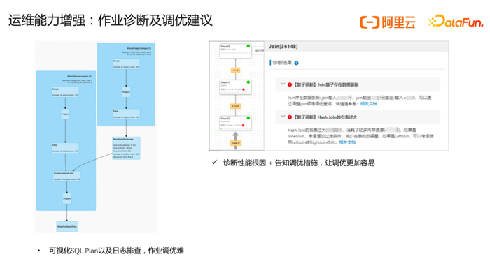 当作业运行出现异常情况时,对作业进行快速诊断调优的能力非常重要,开源Spark用户通过Spark UI查看各Task执行情况以及配合日志分析一些诸如长尾Task,Join计划不合理等问题,然后调整代码逻辑重新提交作业进行调试,整个分析步骤非常耗费时间和精力,调优效率低下并且很多时候效果不佳。为解决此类问题, ADB Spark针对作业提供了诊断和调优服务,运行作业时便可在控制台查看作业是否有异常诊断结果,为更方便客户处理异常作业,ADB Spark除了输出异常作业诊断根因外,还会给出调优建议,包括多表Join后数据膨胀、资源利用率过载、过低等调优建议,让客户以更合理的配置完成作业,解决盲目调优的难题。