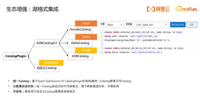 ADB Spark基于Spark CatalogPlugin机制构建了统一的Catalog管理不同的表格式Catalog,如支持Hudi表的HoodieCatalog、Delta表的DeltaCatalog以及ADB内表的ADBCatalog,基于统一Catalog屏蔽Hudi/Delta开源社区中繁琐的catalog和extension等参数配置,开箱即用,在保持易用性的同时,也兼容Hudi/Delta开源社区标准用法以及支持客户自定义Catalog管理其他表格式。