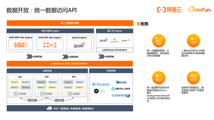 拥抱开源不仅仅只是简单集成Spark/Hudi/Delta等开源引擎,还包括湖仓库表元数据管理,以便多引擎共享,为此ADB 提供了统一元数据服务管理湖仓库表元数据,湖仓中的元数据/权限可互通,不同引擎可自由访问湖仓数据而无需重复创建元数据。对于湖仓数据,为屏蔽底层数据存储格式的差异,便于第三方引擎集成,ADB 提供了面向内存列存格式 Arrow的Lakehouse API服务,提供统一的读写能力,满足业务对仓存储有大吞吐的诉求,对于仓存储已经通过 Arrow 格式完成 Spark 引擎对接。