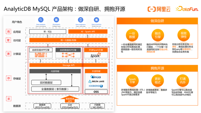 首先介绍下 ADB 产品架构, ADB湖仓版产品架构包含自研和开源两部分。ADB湖仓版在数据全链路的「采存算管用」5 大方面都进行了全面升级和建设。