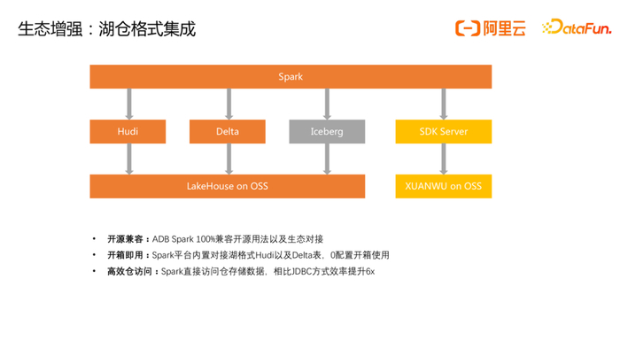在生态建设方面,为降低用户使用湖格式门槛,ADB Spark内置了Hudi/Delta湖格式,开箱即用且完全兼容开源语法,同时ADB Spark也支持客户自定义开发的私有格式。除了内置支持湖存储外,ADB Spark还支持直接访问内部仓存储格式,通过Lakehouse API(SDK方式)对接内部仓存储,显著提高访问仓的吞吐。