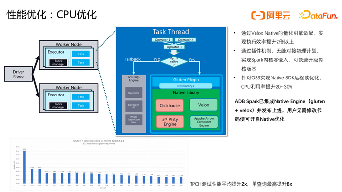 除了对OSS访问进行深度优化外,ADB Spark还引入了Native Engine来加速CPU计算。Spark 1.6 版本以来引入了诸如钨丝计划、向量化 Parquet Reader 等一系列优化后,整体的计算性能有两倍左右的提升。