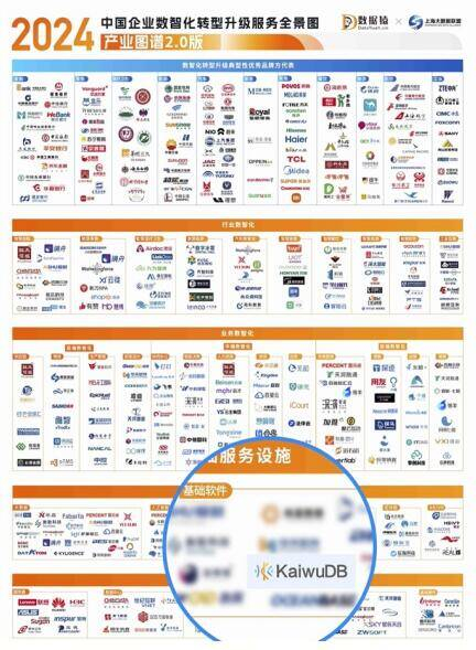 近年来,基于对我国实体产业新兴数字场景的前沿探索与技术深耕,浪潮KaiwuDB创新研发业内首款分布式多模数据库系统,并加速推进数据库、AI等技术在物联网场景下的应用落地与深入实践。凭借在产品性能、架构创新、服务能力方面的突出优势,KaiwuDB先后在山东某重工企业生产调度系统、某车企青岛产业园能源管理系统、济南某台区分布式储能示范项目,某市级大数据中心车辆指挥平台中部署应用,大幅提升系统数据实时处理和数据价值挖掘的能力,缩减IT投入成本,实现数据驱动的增效提质。因此,在数据猿与上海大数据联盟重磅发布的另一份产业图谱《2024中国企业数智化转型升级服务全景图2.0版》中,KaiwuDB也被列为【基础服务设施-基础软件】代表企业。