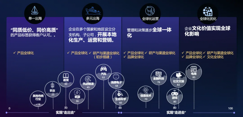 ● 其他高技术制造(包括机器人、高端制造设备、半导体、航天航空设备等,不包括生命科学、消费电子和汽车)、能源、教育行业的出海进程在政策与技术等方面的促进下不断加深,但进度相对比较慢,主要体现在研产与渠道全球化、品牌全球化能力仍需进一步加强。