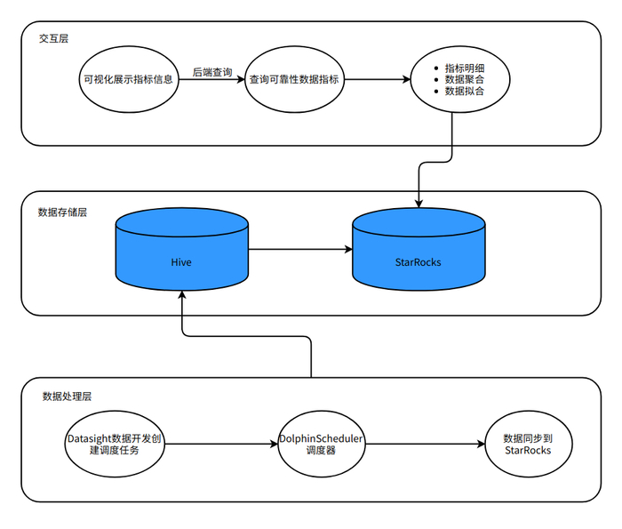 鉴于可靠性精准载荷指标维度的多样性,我们采用 StarRocks 聚合模型表,针对用户频繁查询维度建立多个维度的 Rollup 索引。增加 Rollup 索引后,多指标同时查询计算速度可由 15 秒缩减至 2s 左右,性能提升了近 8 倍。下图展示了集成 StarRocks 的可靠性数据库系统架构: