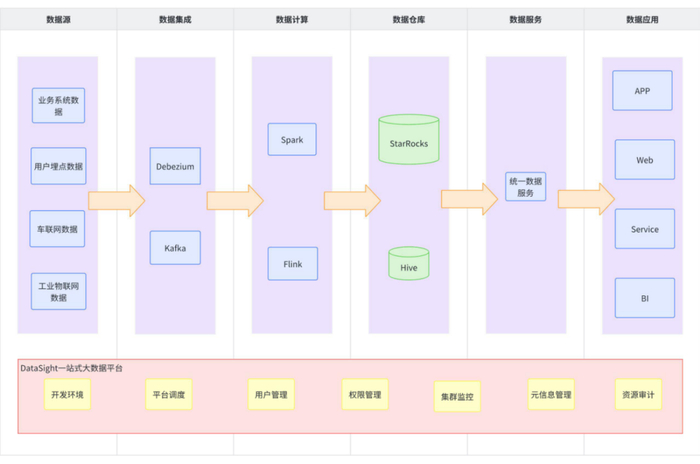 在我们的大数据架构中,来自 Kafka/Hive 的业务/用户数据源,通过 Broker Load/Routine Load/Stream Load/Flink Connector 等多种离线/实时导入方式写入 StarRocks,主要用来存储 DWD/DWS/ADS 层的数据,用于离线和实时指标的快速分析。我们深度自研的 DataSight 一站式数据治理与开发平台,已经集成了 StarRocks,支持通过配置化方式方便的读写 StarRocks。