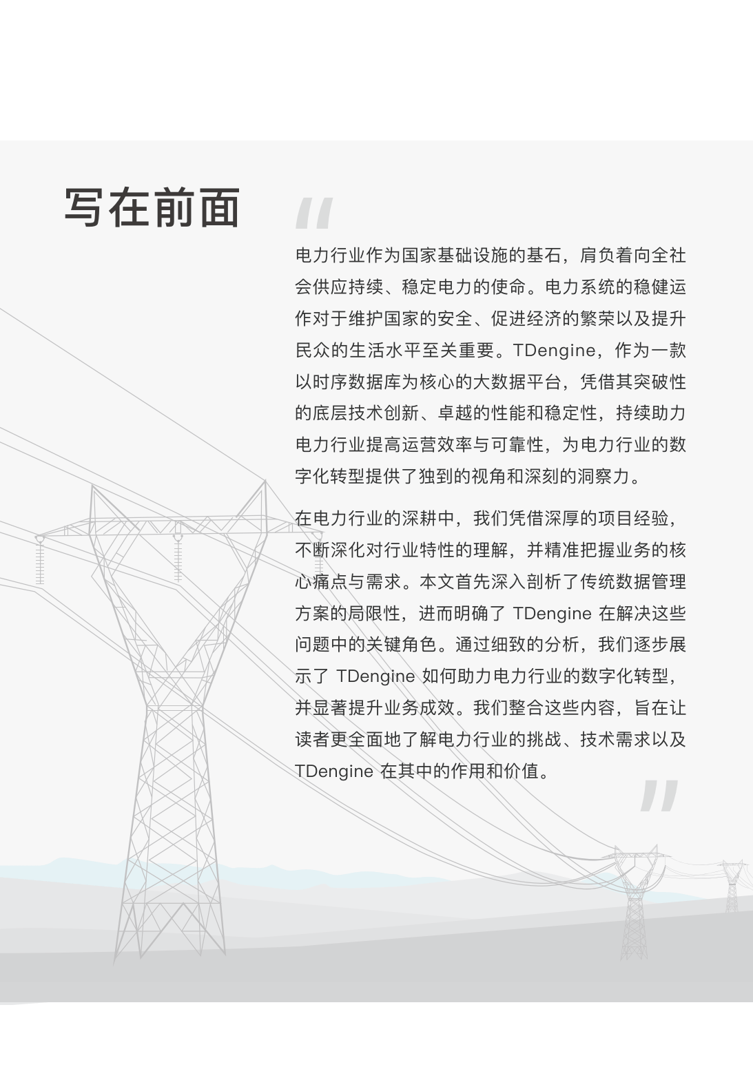 电力行业作为国家基础设施基石,正面临智能电网与新能源发展带来的数智化转型挑战。TDengine作为高性能分布式时序大数据平台,为电力行业提供了从数据管理到实时监控的全链条解决方案,助力行业突破传统技术瓶颈,实现高效转型。