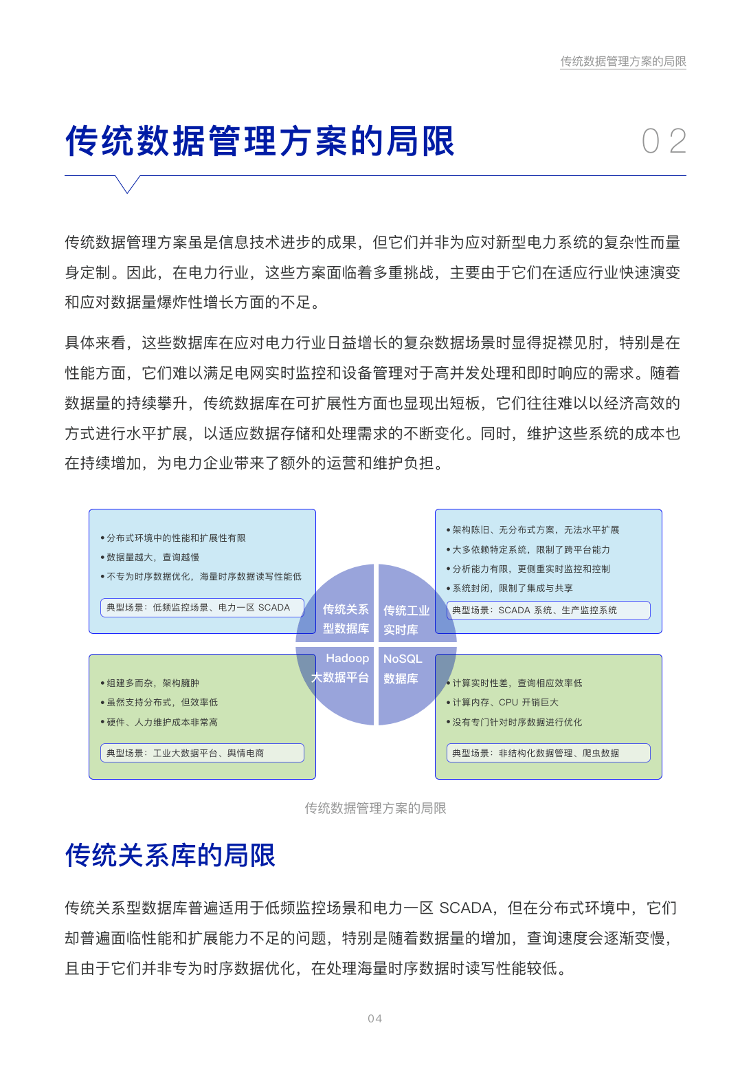 传统关系型数据库在分布式环境中性能与扩展性不足,处理海量时序数据读写效率低;工业实时库依赖特定系统,架构封闭且缺乏分布式扩展能力;Hadoop组件臃肿、运维成本高,分布式处理效率有限;NoSQL计算实时性差、资源消耗大,均无法满足新型电力系统需求。