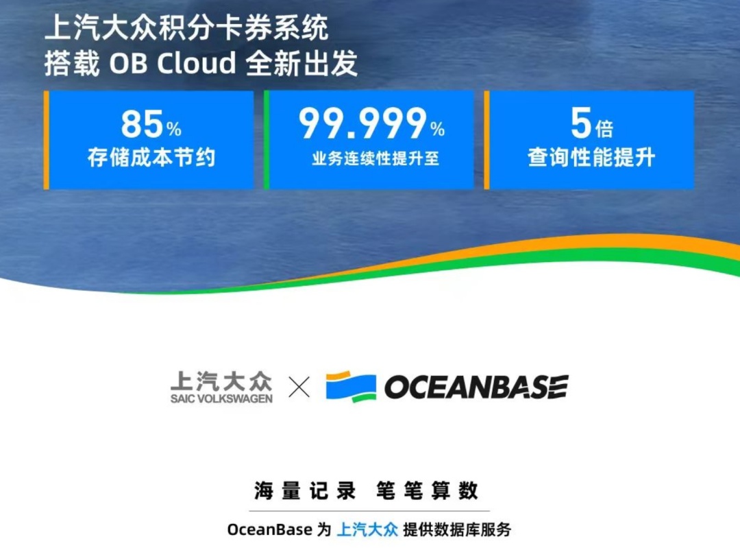 oceanbase积极服务上海产业发展。上汽大众作为历史悠久的中德合资汽车企业,在数据库技术领域经历了从商用数据库到自主研发数据库的转变,并积极探索云数据库技术,经过多方比对与严谨测试,最终引入oceanbase数据库进行卡券积分系统的升级改造,应对卡券积分系统大数据和高并发的业务挑战。数据库系统升级后,上汽大众卡券积分系统存储容量节省 85%,总成本相对于 rds 至少节省 15%,业务异常风险降低,高可用稳定性进一步提升。