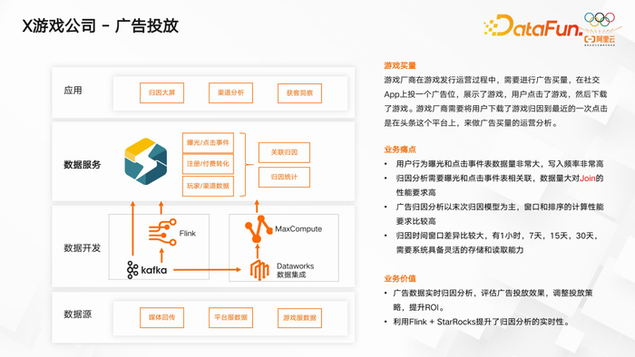 该游戏公司的架构与之前提到的场景类似,从 Kafka 读取元数据,通过 Flink 处理后,写入 StarRocks 进行实时查询、业务报表和大数据展示等典型场景。这种架构充分利用了 StarRocks 的性能优势,满足了游戏公司对高效数据处理和分析的需求。