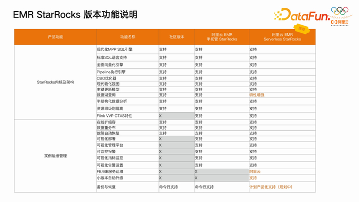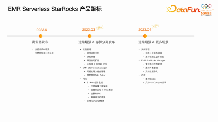 在 EMR的规划中,StarRocks 成为 OLAP 领域的重中之重。目前,EMR 中的所有 OLAP 业务重心都集中在 StarRocks。我们在 6 月 1 日正式开始商业化运营,随着 2.5 版本的发布,支持了传统 BI 场景和数据库分析场景。目前已经发布支持 StarRocks 存算分离版本,存算分离版本 beta 测试中。