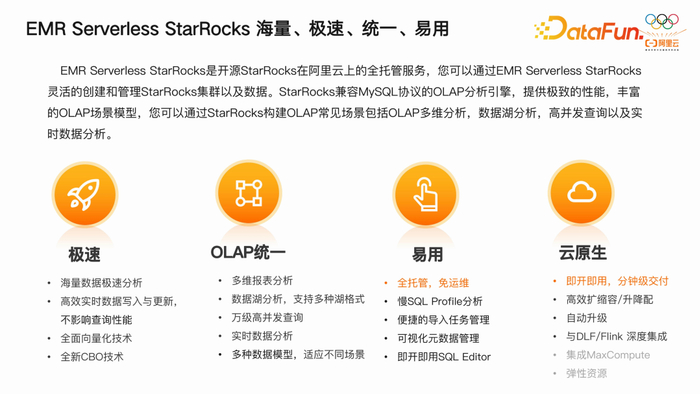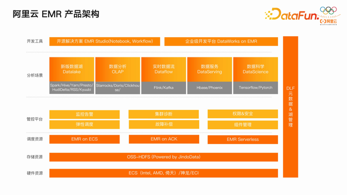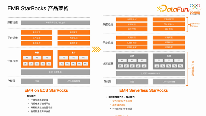 EMR 产品主要包括三种形态,来满足不同场景的需求。首先,on ECS 半托管形态,该形态已逐渐成为主流,受到了广泛关注。其次,on ACK 形态,即基于 Kubernetes(K8S)的容器化形态,也在逐步完善和推广。此外,我们首次在 EMR 中引入了 Serverless 形态,以 StarRocks 引擎为代表,降低了用户在使用大数据处理引擎时的运维负担。