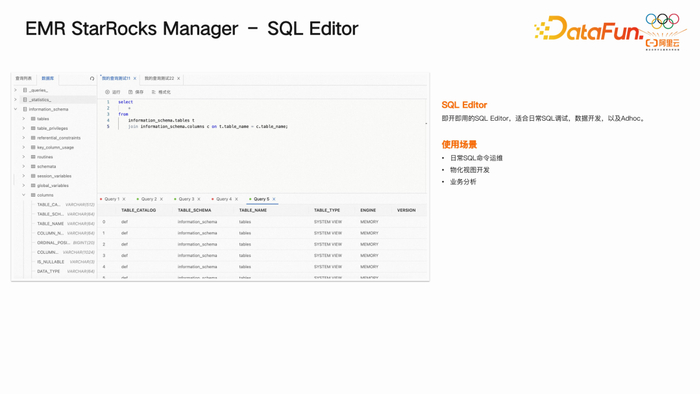 此外,还针对内核和管控方面做了许多数据运维管理工作,例如可视化分析 MySQL 的性能数据、导入任务管理、元数据管理以及外表元数据管理等。为了方便用户进行 Adhoc 场景操作,还提供了 SQL Editor 等工具。