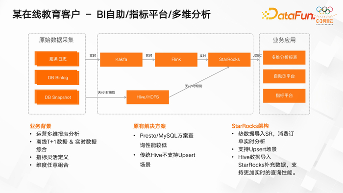 该客户典型的 BI 报表分析平台包含自定义报表和多维分析场景。整个数据链路如下:从 MySQL 或服务日志等来源通过 Kafka 传输,经过 Flink 处理后写入 StarRocks,最终完成数据应用。此外,为了保证热数据缓存和后续指标平台的运行,他们还需要将离线数据同步至 StarRocks,采用按天或小时级的数据同步策略。