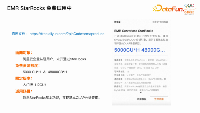 只要是阿里云的正常账号,且此前未开通过 EMR 和 StarRocks 相关产品,均可免费开通入门版,感兴趣的用户可以参加相关活动。目前,该版本虽免费,但资源有限。例如,每小时 5000 CU 和 48000 GB 存储空间。以 12 CU 为例,用户可连续使用约 20 天。当然,我们也注意到部分用户的诉求,他们希望开设更大规格的版本。因此,我们计划在 12 CU 基础上增加 32 CU 规格,以满足这些用户的需求。用户可根据自身需求选择合适规格的版本,既可以简单测试性能,又不必担心资源浪费。