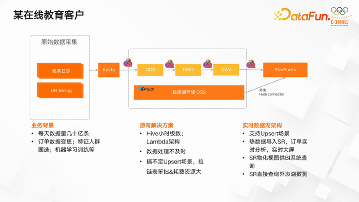 这是一个采用数据湖存储架构的在线教育客户,他们使用了 Hudi 作为数据存储方案。数据从 Kafka 流入,通过 Flink 处理后,写入 Hudi 格式存储在数据湖中,如 SSR 等。然后,利用 StarRocks 以外表形式进行 OLAP 分析,替代了原有架构中的 Presto。