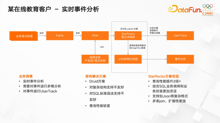 客户在实时数据分析场景中,采用了 Kafka、Flink、StarRocks 等工具进行数据处理。数据从 Kafka 流入,经过 Flink 处理后写入 StarRocks。在 StarRocks 端,数据按照天进行分区,按照用户 ID 进行分桶,生成数据埋点详细表。此外,还创建了一些小时级物化视图,实现了简单的 ETL 流程。这种处理方式既不算是数仓,也不算是复杂的数据分析,而是提前进行了一些预处理,以满足后续固定维度的事件分析需求。