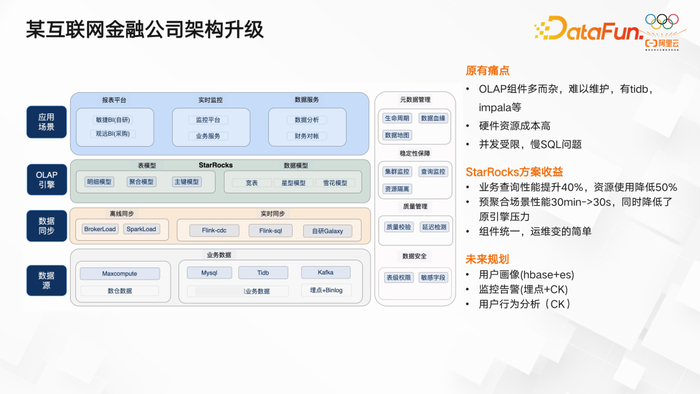 这是一家互联网金融客户,他们曾使用过多款 OLAP 组件,如 CK、Impala 和 TiDB 等。然而,这些组件繁多,难以维护。此外,在 TiDB 上的并发性能受到限制,由于集群规模和成本等因素,某些场景下无法实现更多任务。因此,他们在寻求一种能够提高查询性能并降低资源消耗的解决方案。