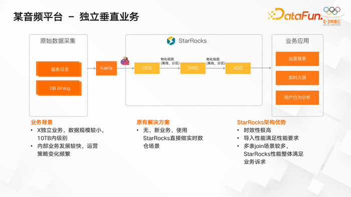 这是一家大型音频公司,他们在某一块独立业务上尝试使用 StarRocks。这一场景主要针对小型数据仓库,特点是数据量较小,规模在 7、8 TB 左右。为了避免物化视图稳定性问题,他们选择了 StarRocks 作为解决方案。