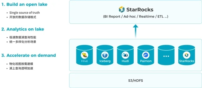 基于 StarRocks,用户可以高效的构建 Lakehouse 数据分析架构,用户可以选择 StarRocks 内表或开放数据湖 Apache Iceberg、Apache Hudi、Apache Paimon 做为统一的数据存储,基于 StarRocks 服务BI报表、Ad-hoc 等多样化的分析场景,对于业务性能要求高的查询,通过物化视图技术实现按需透明加速。