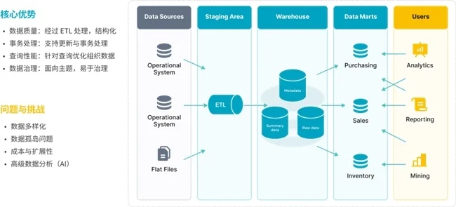 数据仓库在数据质量、事务处理、查询性能、数据治理等方面有明显的优势,但随着数据分析的需求越来越大,数据仓库的方案也面临一些挑战。
