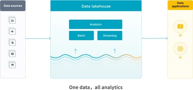 数据湖仓兼具数据仓库与数据湖的优势,湖仓具备开放统一的数据存储能力,并基于统一存储直接服务批处理、流处理、交互式分析等多种分析场景,实现湖仓 One data,all analytics 的业务价值。