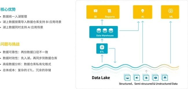 湖仓分层架构融合了数据湖与数据仓库的优势,但面临一些问题与挑战。部分数据从数据湖导入到数据仓库,数据链路的增长影响数据分析的时效性,两份数据也会带来冗余存储、数据口径不一致的问题;另外,对于数据仓库里加工产生的数据,仍然很难高效的服务 AI 场景。