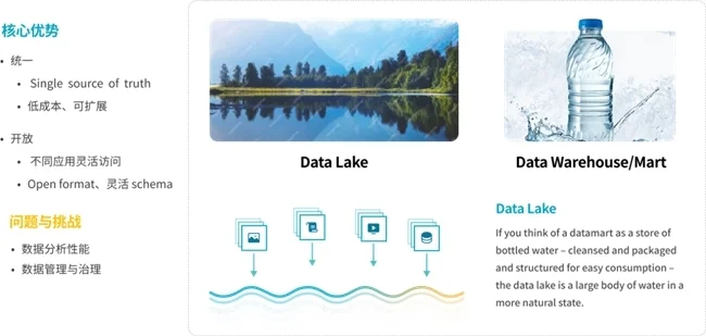 如果把数据仓库/集市类比为瓶装水,数据湖则是以更加原生态方式存储数据的大池子。数据湖的核心优势是统一与开放,数据基于对象存储、HDFS 等系统实现低成本、可扩展的 数据存储,并作为企业数据的 Single Source of Truth(SSOT);同时数据的数据格式是开放的,便于不同的应用灵活访问。